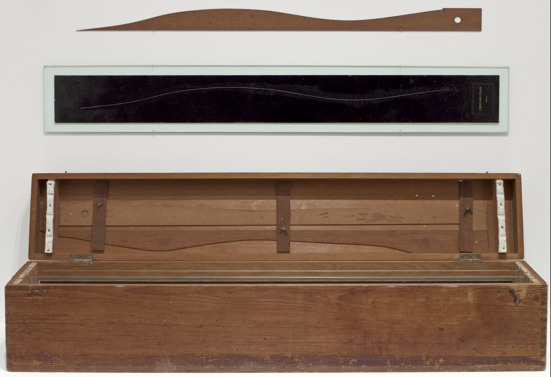 私たちが日常的に用いる長さを測定する単位としてメートル(metre)法が採用されている。この単位系が考案された 17世紀には、2秒の間隔を刻む振り子の長さを基準とし、以降流通の過程において厳密さが要求され、測定環境における不確実性を退けるため、現在では光が真空中を伝わる長さとして定義されている (*2)。また、メートル法が現在の定義となる途上で、単位の定量性を保存するため「アルシーヴ原器」あるいは「メートル原器」が製造された。それはいわば「定規のための定規」で、18世紀から19世紀にかけて考案 された子午線による定義を白金(あるいはイリジウムとの合金)によって鋳造し、実体化したものである。 マルセル・デュシャンに《三つの停止原器》(3 Standard Stoppages, 1913-14)という作品がある(fig.2)。これは、1メートルの長さの3本の縫い糸を、同じく1メートルの高さからカンバスの上に落とし、このとき描かれた曲線をニスで固定し、木型に写し取ったものと言われている ( * 3 ) 。 デュシャンは《三つの停止原器》による曲線を、《大ガラス》をはじめとしたいくつかの作品に用いていた。